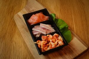 Vistrio: 100 gram gerookte zalm, 100 gram palingfilet en 100 gram rivierkreeft voor € 18,00.